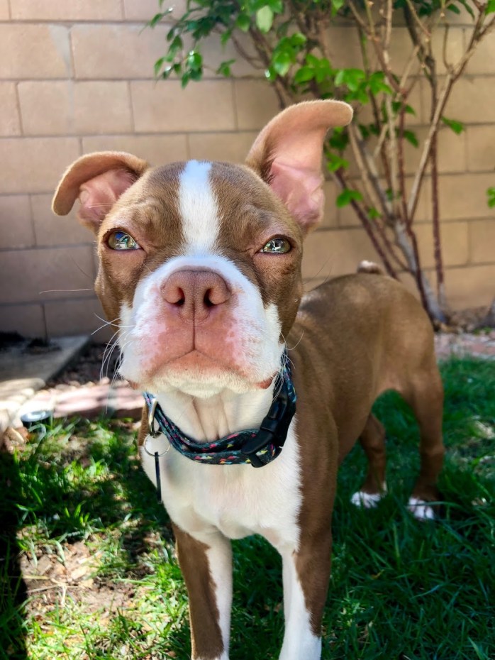 Rhea is a Boston Terrier, born on December 1, 2018, in Oklahoma. She has a beautiful Red and White Tuxedo Coat, with Green eyes. We were able to meet her parents; her mom was a Champagne color and her dad was Blue.